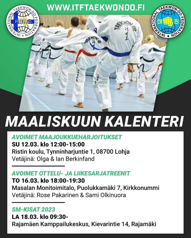 Liitteenä kutsu. Muille kun maajoukkueen jäsenille harjoitukset maksavat 10€, joka maksetaan liiton tilille. Saaja: ITF Taekwon-Do Liitto ry IBAN: FI58 5554 0920 0846 46 BIC: OKOYFIHH T: Hannu Salo Liitteet